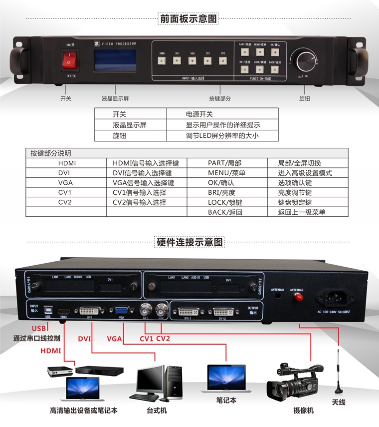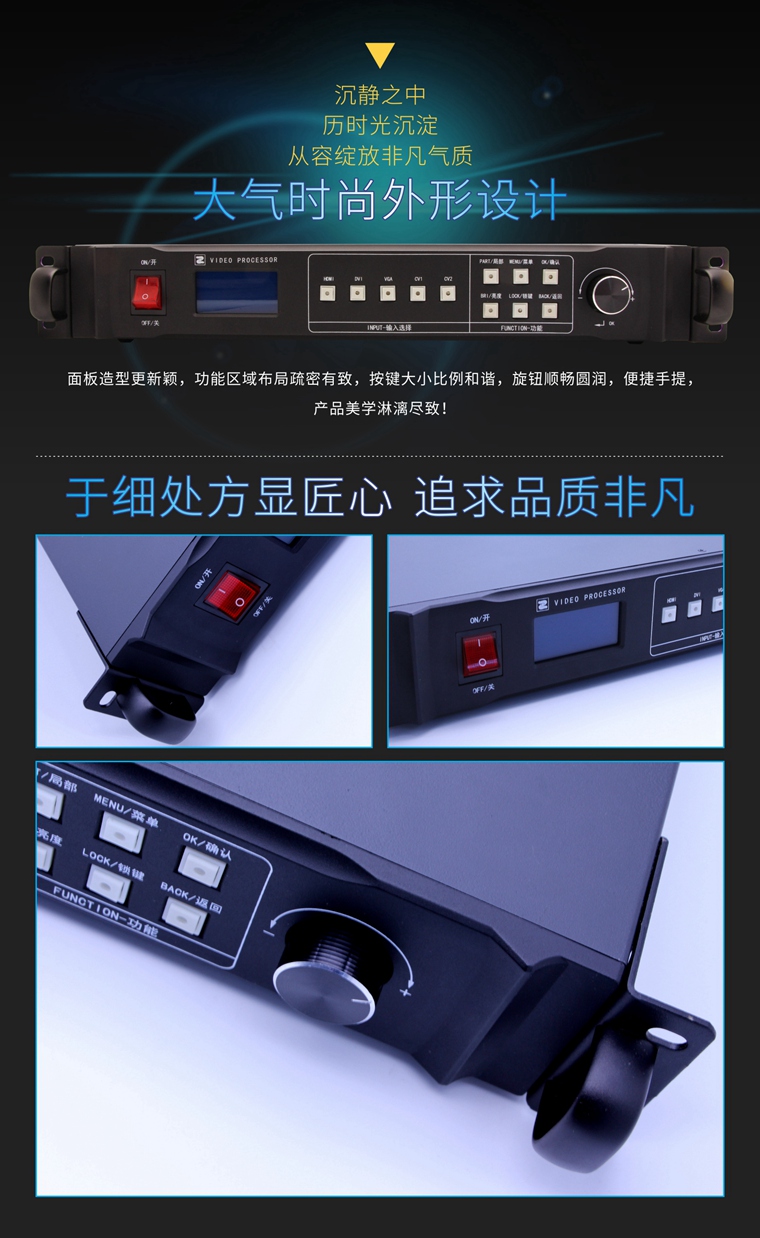 7) 智能鎖鍵:⒈菜單鎖模式:僅開放信源切換按鈕,處理器參數(shù)不可調(diào),防止客戶誤操作導(dǎo)致處理器參數(shù)錯亂。⒉全鍵鎖模式:鎖定所有按鈕,防止誤觸 。