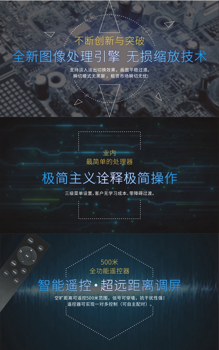 8) 支持淡入淡出,瞬切無黑屏:⒈支持淡入淡出切換效果,畫面平穩(wěn)過渡。⒉瞬切模式無黑屏 ,租賃市場瞬切無憂!