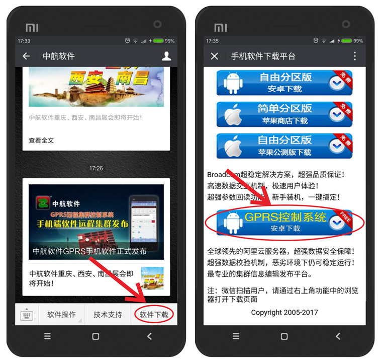 第1種方法:進(jìn)入中航軟件微信公眾平臺(tái),點(diǎn)擊右下角“軟件下載”--點(diǎn)擊“GPRS控制系統(tǒng)安卓下載”按鈕。使用瀏覽器打開(kāi),點(diǎn)擊下載,安裝完畢即可使用。