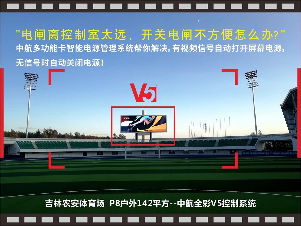 【中航V5精品案例選集】:“電閘離控制室太遠(yuǎn),開(kāi)關(guān)電閘不方便怎么辦”?中航多功能卡智能電源管理系統(tǒng)幫你解決,有視頻信號(hào)自動(dòng)打開(kāi)屏幕電源,無(wú)信號(hào)時(shí)自動(dòng)關(guān)閉電源!吉林農(nóng)安體育場(chǎng),P8戶外142平方,中航全彩系統(tǒng)完美點(diǎn)亮。感謝長(zhǎng)春科美李總對(duì)中航的大力支持,我們會(huì)努力做的更好!