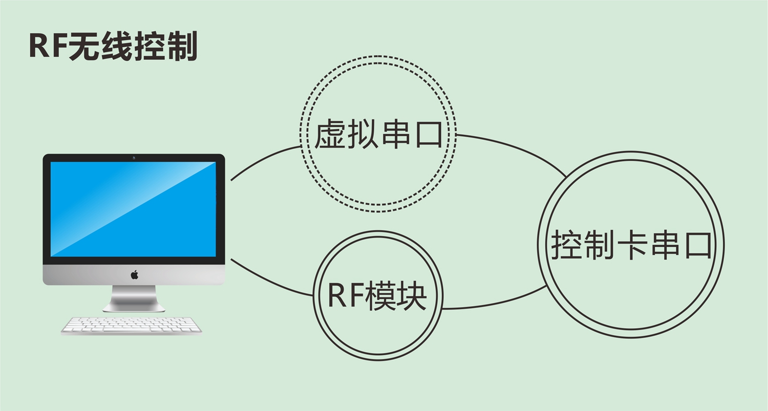 工作原理:RF模塊一端接到控制電腦,另一端接到控制卡串口,電腦安裝驅(qū)動(dòng)程序后,產(chǎn)生一個(gè)虛擬串口,并通過此串口發(fā)送數(shù)據(jù)。